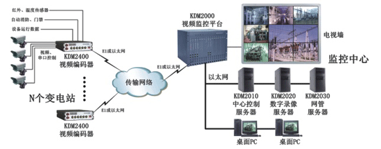 監(jiān)控中心可同時(shí)監(jiān)控所有的遠(yuǎn)端變電站,主要部署了KDM2000視頻監(jiān)控平臺(tái)、KDM2010中心控制服務(wù)器、KDM2020數(shù)字錄像服務(wù)器、KDM2030網(wǎng)管服務(wù)器和電視墻設(shè)備。KDM2000是一臺(tái)嵌入式模塊化的大型監(jiān)控平臺(tái),與普通的PC監(jiān)控平臺(tái)不同,其可直接支持112個(gè)E1或者448個(gè)2Mbps以太網(wǎng)碼流的接入。遠(yuǎn)端變電站的KDM2400通過(guò)E1或者以太網(wǎng)方式統(tǒng)一接入到KDM2000,由KDM2000負(fù)責(zé)碼流的轉(zhuǎn)發(fā)和處理。KDM2000可內(nèi)置多路視頻解碼模塊和多畫面分割模塊(最多16畫面分割),通過(guò)與電視墻或者大屏幕顯示設(shè)備的配合,可讓監(jiān)控中心同時(shí)監(jiān)控多個(gè)變電站的畫面,并可進(jìn)行輪詢監(jiān)控。系統(tǒng)中還配置了三臺(tái)服務(wù)器,其中KDM2010中心控制服務(wù)器主要負(fù)責(zé)遠(yuǎn)端監(jiān)控點(diǎn)的攝像頭、云臺(tái)等外設(shè)的控制和告警信號(hào)的輸入/輸出控制等功能;KDM2020數(shù)字錄像服務(wù)器負(fù)責(zé)提供數(shù)碼錄像和視頻點(diǎn)播功能,當(dāng)系統(tǒng)要求錄像的存儲(chǔ)時(shí)間比較長(zhǎng)時(shí)可采用超大容量的磁盤陣列替代;KDM2030網(wǎng)管服務(wù)器負(fù)責(zé)整個(gè)網(wǎng)絡(luò)的全程網(wǎng)管,可在監(jiān)控中心實(shí)時(shí)觀看網(wǎng)內(nèi)所有KDM設(shè)備的運(yùn)行狀況和設(shè)備告警信息。